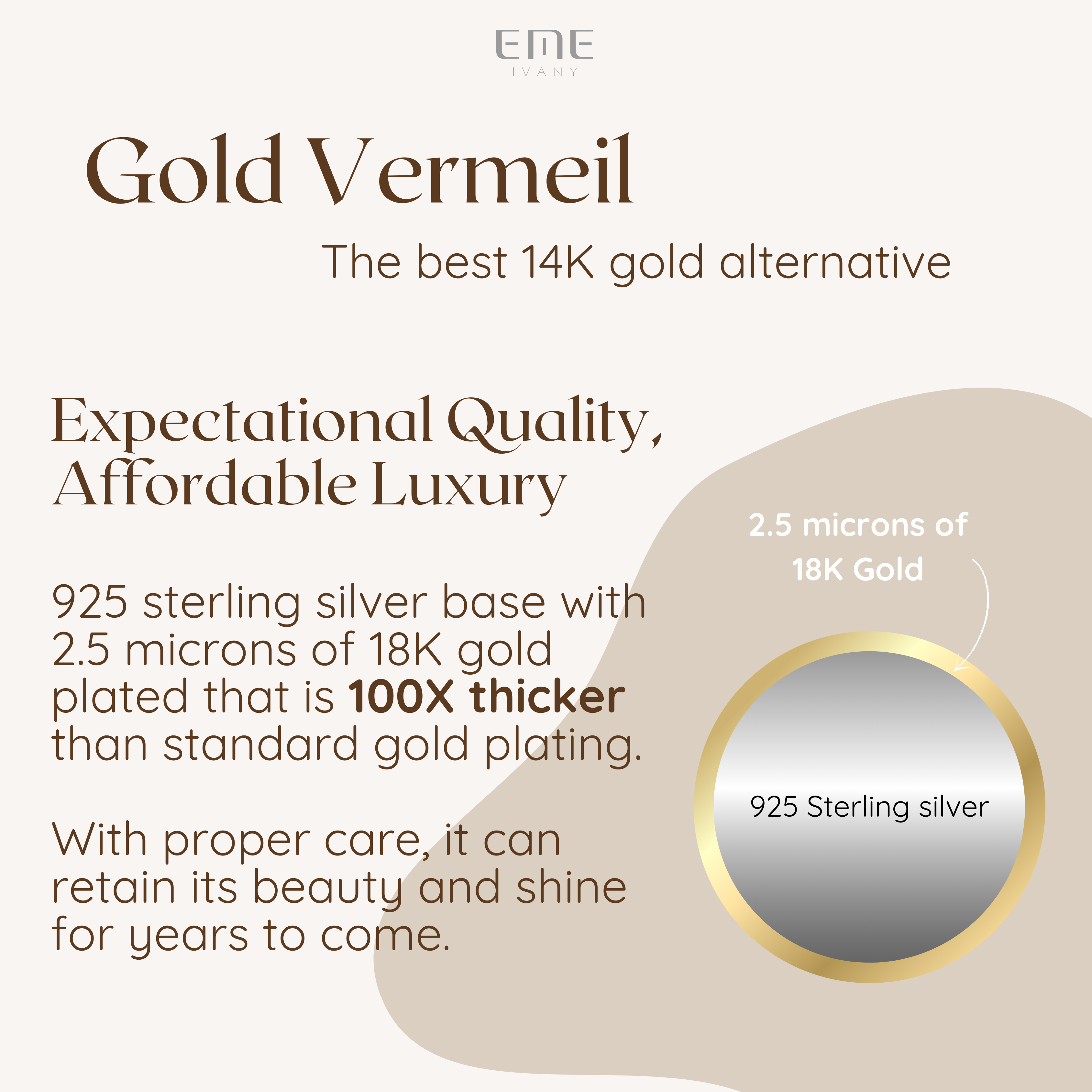 This is 100 times thicker than the regular flash gold plating in the market. This ensures our gold vermeil pieces can last for years with proper care.
